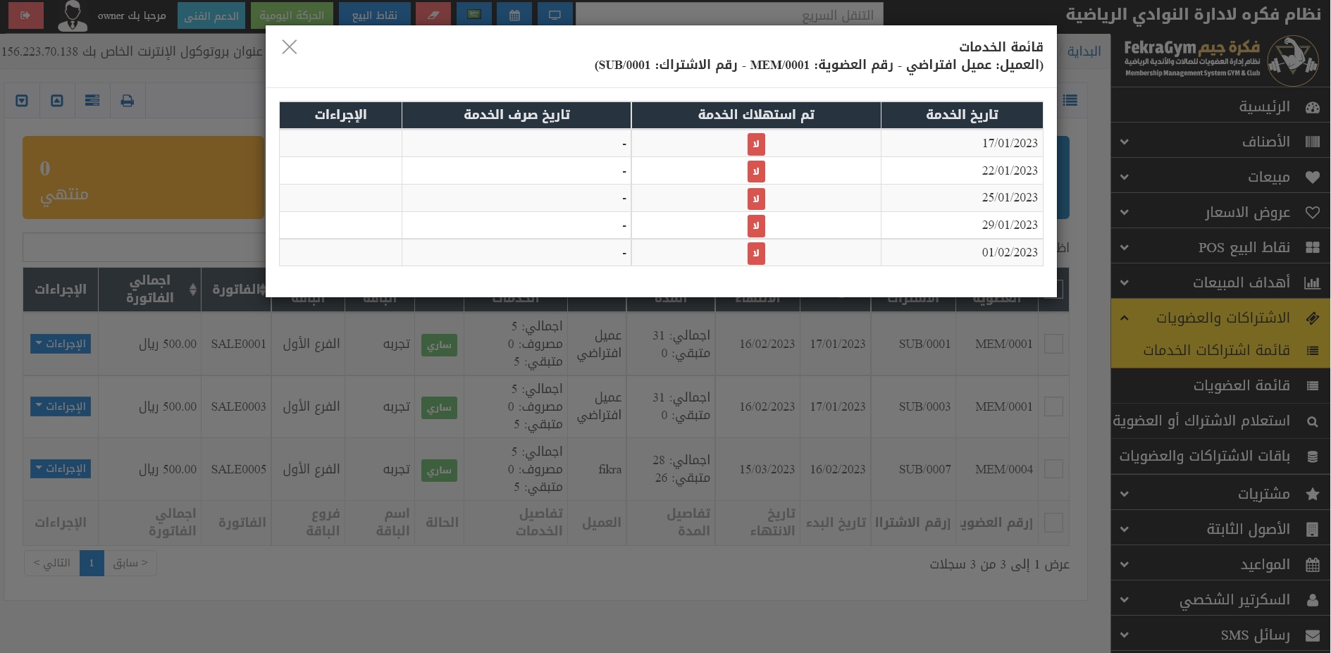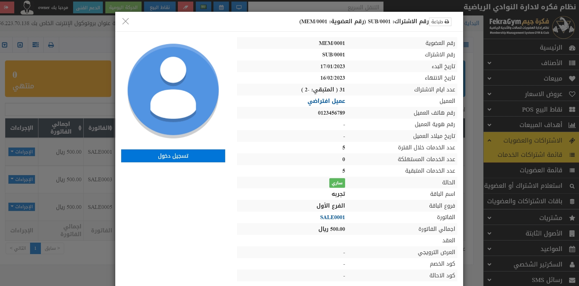 هذا النظام من شأنه تسجيل العضويات واشتراكات العملاء الجدد وإدارة العضويات القديمة عبر إنشاء ملف خاص بكل عميل على النظام، هذا الملف يضم المعلومات الشخصية الخاصة بالعميل، وبيانات الاشتراك كافة، من أول تاريخ الاشتراك، ونوع العضوية، وغيرها من البيانات الهامة.