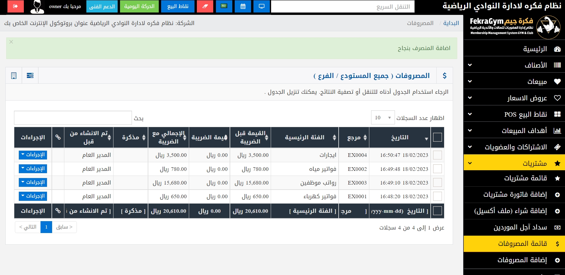 يوفر البرنامج شاشة خاصة بمصروفات منشأتك الرياضية يمكن من خلالها تسجيل وإدخال أي مصروفات تمت لأي غرض لتمكين حساب مُجمل مصروفات المنشأة بدقة وسهولة إلى جانب تخصيص جهة الصرف عن طريق إدراج كل مصروف تحت البند الخاص به مثل مصاريف إيجار المكان ومصاريف الكهرباء والأجهزة ومصارف الصيانة الدورية وغيرها من المصاريف ودعم إصدار تقارير تفصيلية لمصروفات كل بند من هذه البنود أو بشكل إجمالي لكافة البنود وجهات الصرف.
