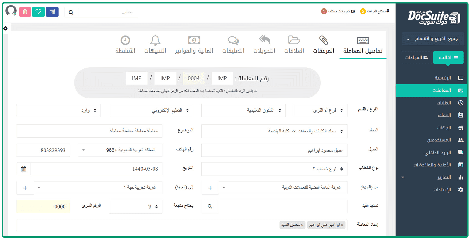 نظام متكامل يشمل جميع أنواع وأشكال المعاملات والمراسلات داخل المؤسسات سواء كانت مراسلات إدارية داخلية أو خارجية (الصادر والوارد)، ويقوم على أربعة محاور رئيسية لتوفير أفضل إدارة للصادر والوارد وهي تسجيل المعاملة وأرشفتها تلقائيًا وتتبع حركة الإحالة للمعاملة والاستعلام والتصدير لها حتى الانتهاء منها واتخاذ قرار بشأنها سواءً بالحفظ أو كصادر عام.