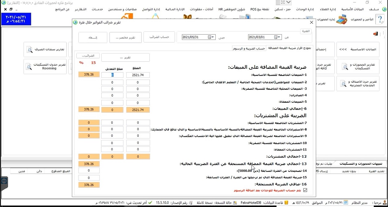 دعم كافة أنواع الضرائب المعمول بها في المملكة والخاصة بقطاع السياحة أو قطاع تقديم الخدمات مثل رسوم إشغال مرافق الإيواء "بلدي" وضريبة القيمة المضافة VAT لتسهيل احتسابها تلقائيًا على قيمة الخدمات المقدمة.