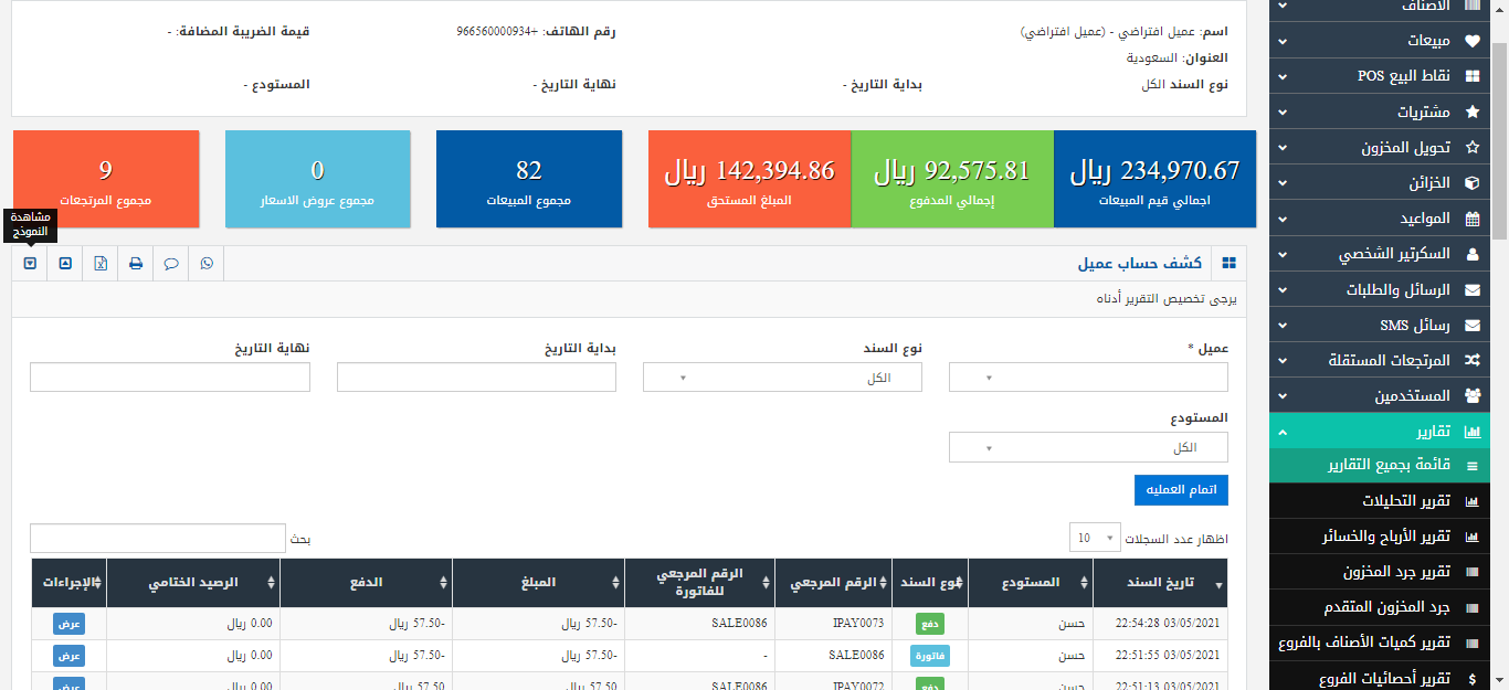 إدارة حسابات العملاء والمبيعات النقدية والآجلة والشيكات بفاعلية عبر نظام يساعدك على إدارة كل ما يتعلق بالعملاء وبياناتهم وكافة التعاملات معهم من مبيعات ومرتجعات وخصومات وسداد بالإضافة إلى تحليل مبيعاتهم فى مجموعة تقارير وإحصائيات.